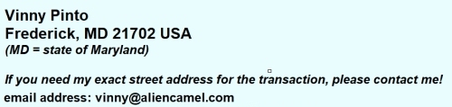 All payments must be in US dollars and made payable to "Vinny Pinto". If you wish to send a cashier's check, certified check or money order, my full name and address are below. Personal checks are also accepted, if you do not mind the wait for the funds to clear at the bank (up to 10 business days from time of receipt).